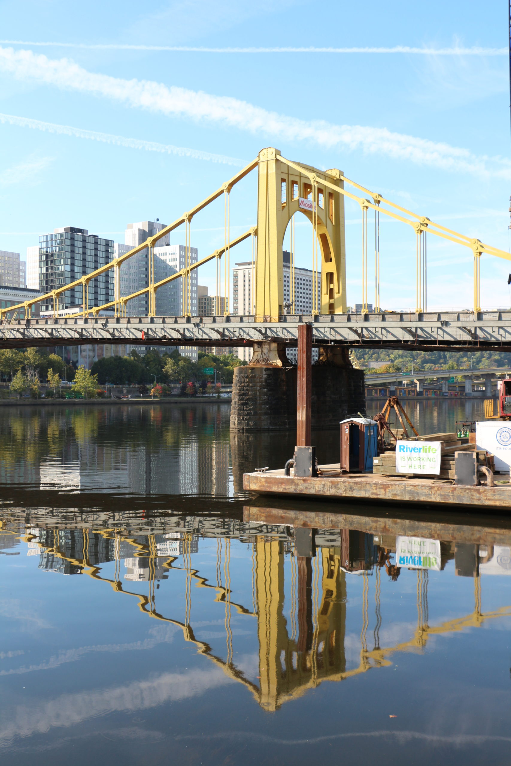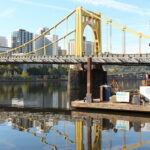 The Clemente Bridge and barge reflected in the Allegheny river. Photo by Pure Zheng